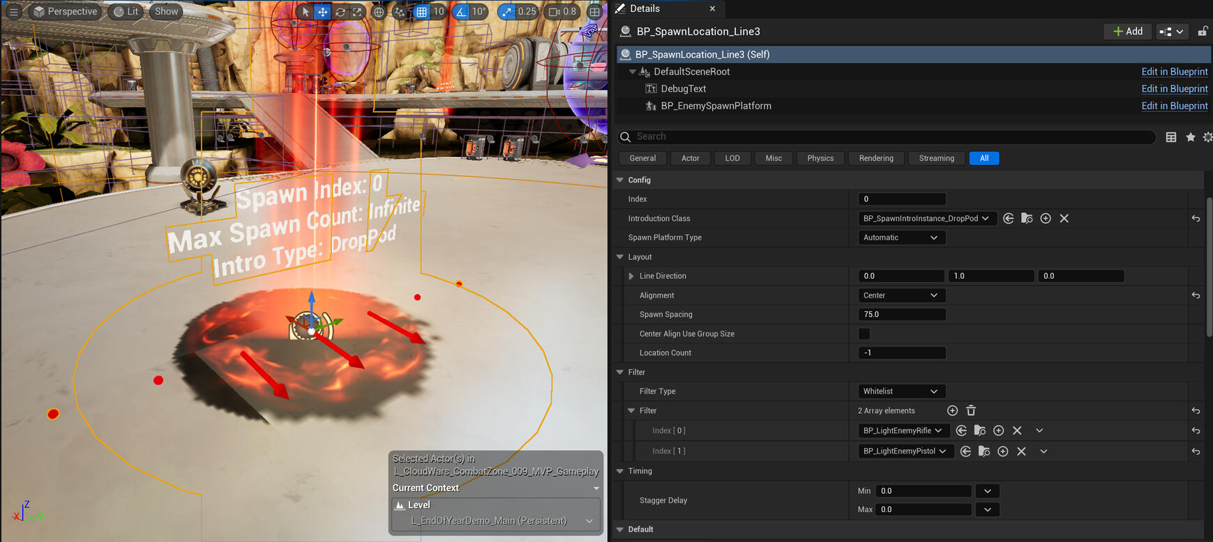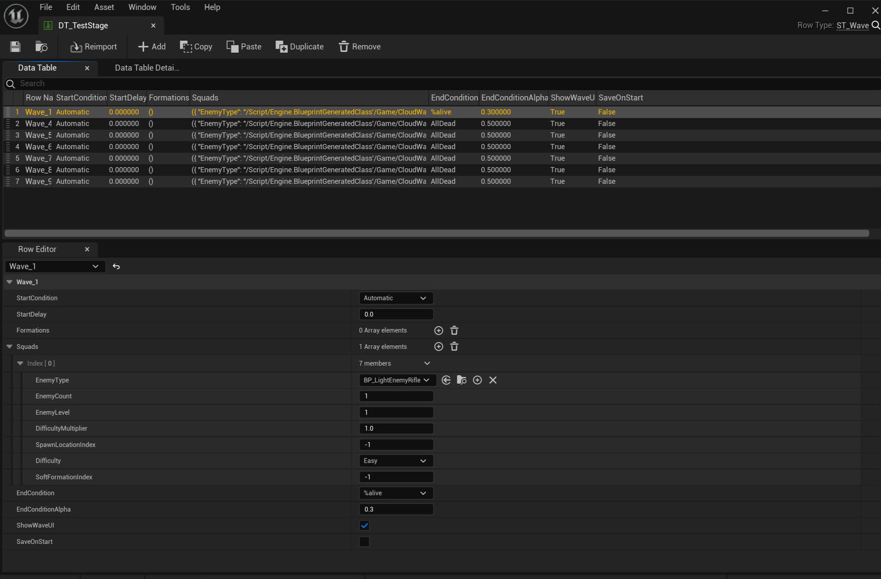An important part of game feel is the rate and method that enemies spawn into the level.For this i've build several different iterations of a spawning system all throughout development. The final version works through a combination of a data table and spawn locations.The wave table has many different settings to controll which types of enemies spawn, the amount, which spawn locations they can use, when the next wave starts and how all of this changes based on the difficulty setting of the game.The locations simply indicate a valid place for an enemy to spawn alongside a filter to block certain enemy types and an which intro animation it should play.